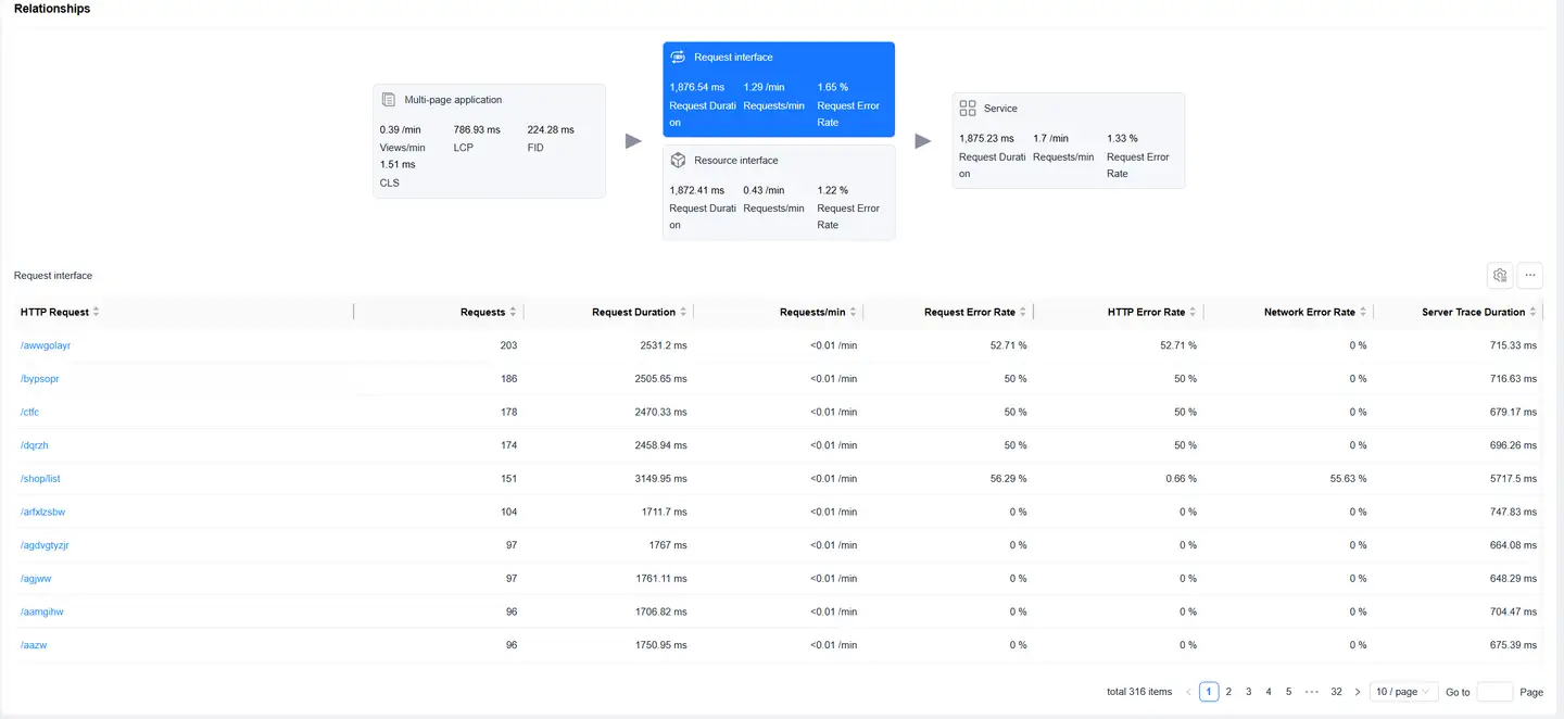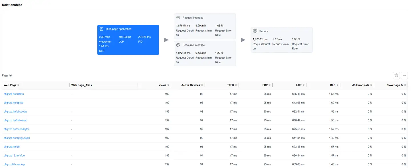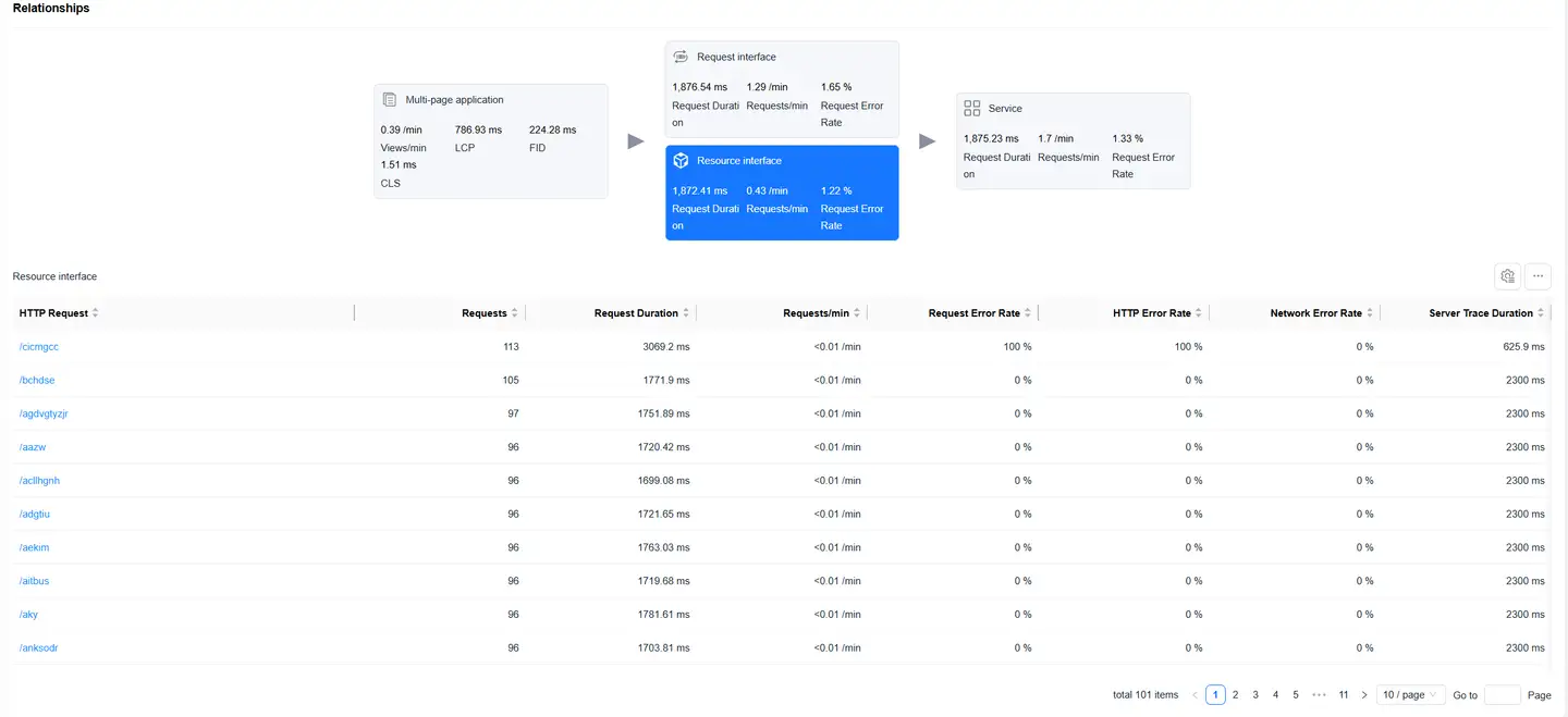 Displays the complete chain from Web page loading to backend services, helping to analyze performance bottlenecks.
