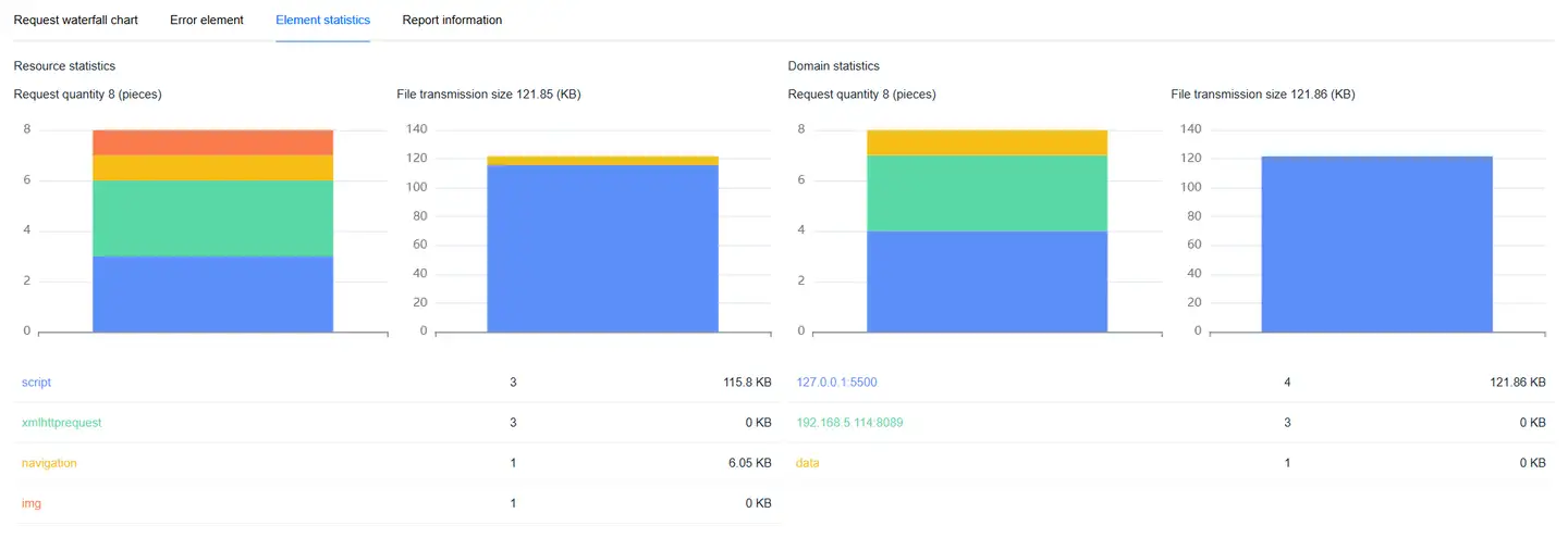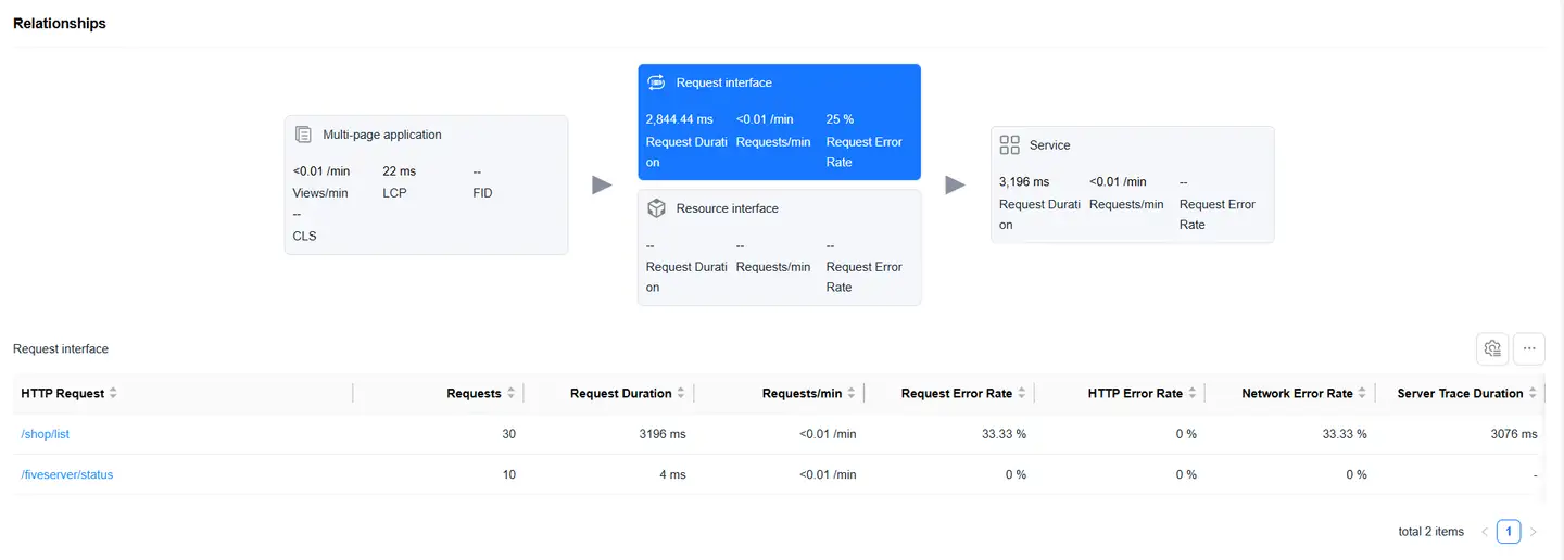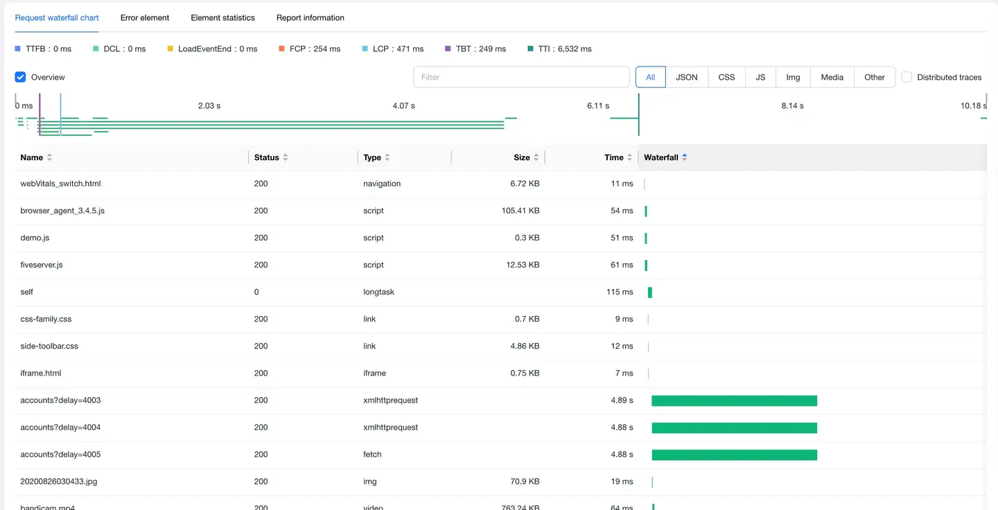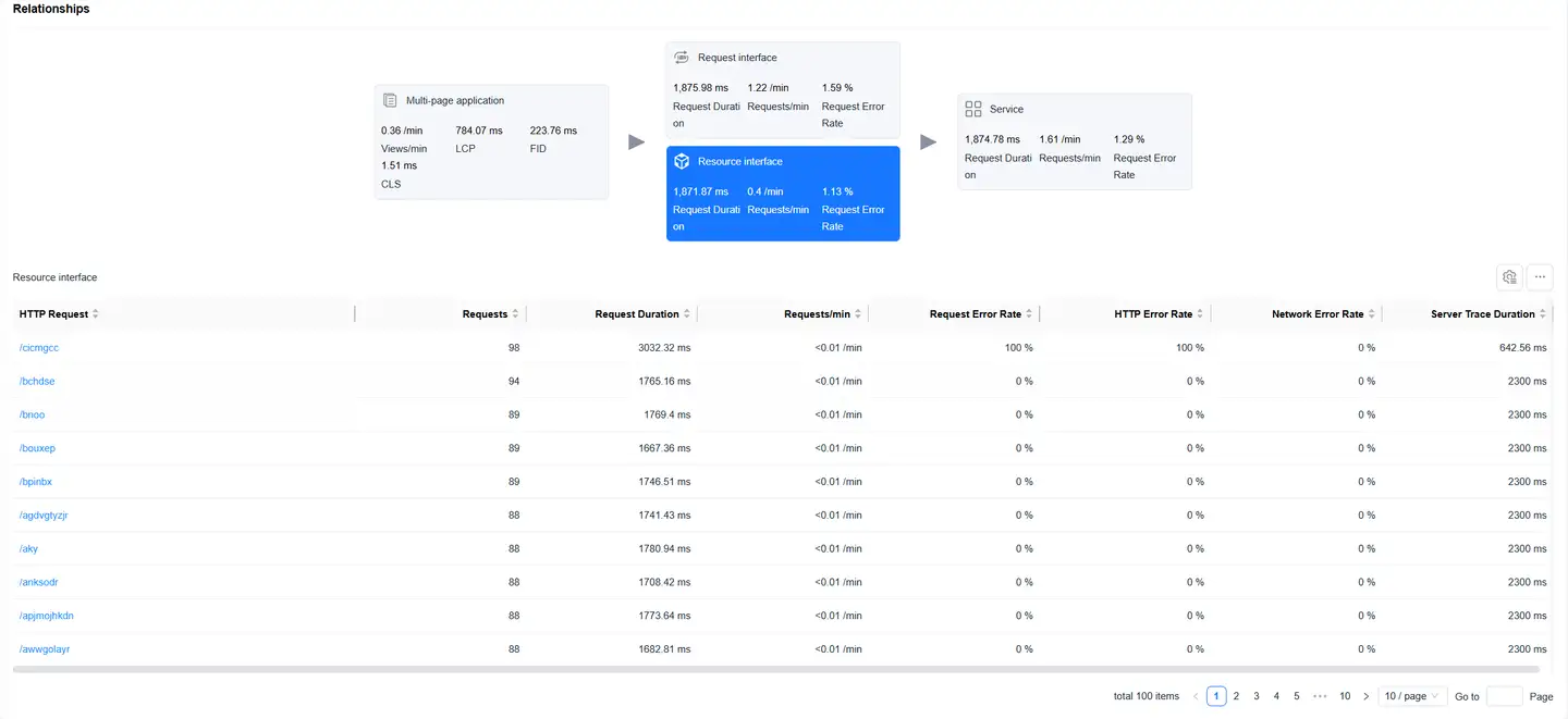 Displays the complete chain from Web page loading to backend services, helping to analyze performance bottlenecks.