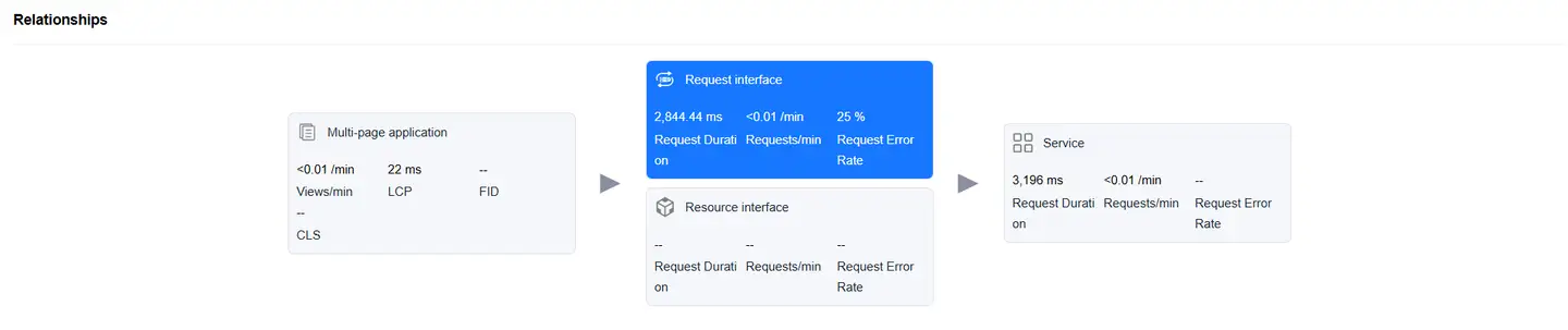 Displays the complete chain from a single application page load to backend services, helping to analyze performance bottlenecks.