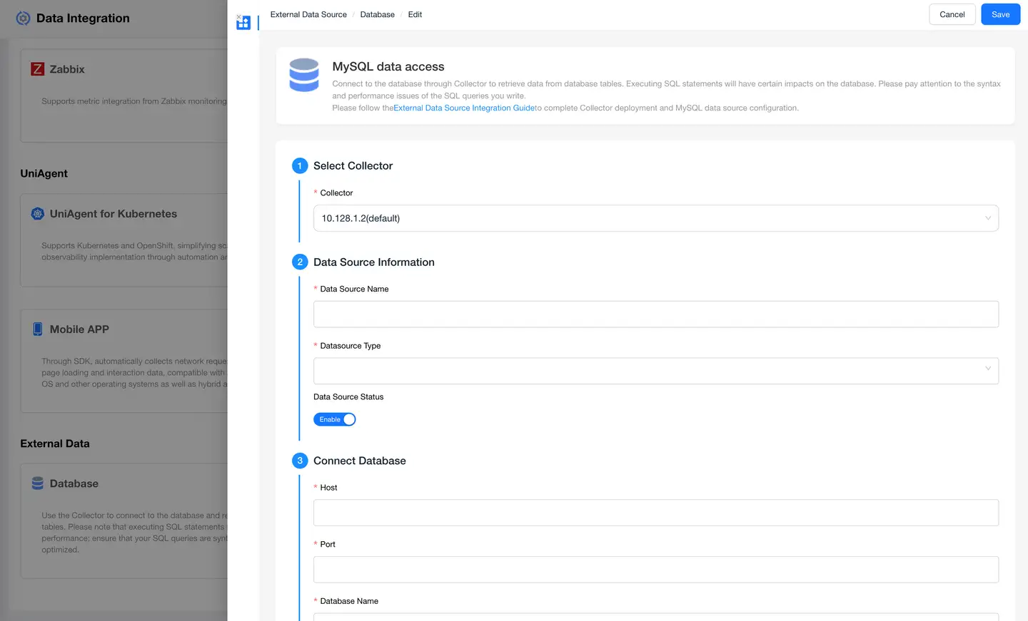 For details, see Integrating External Data Source Data to install Collector for MySQL data collection.