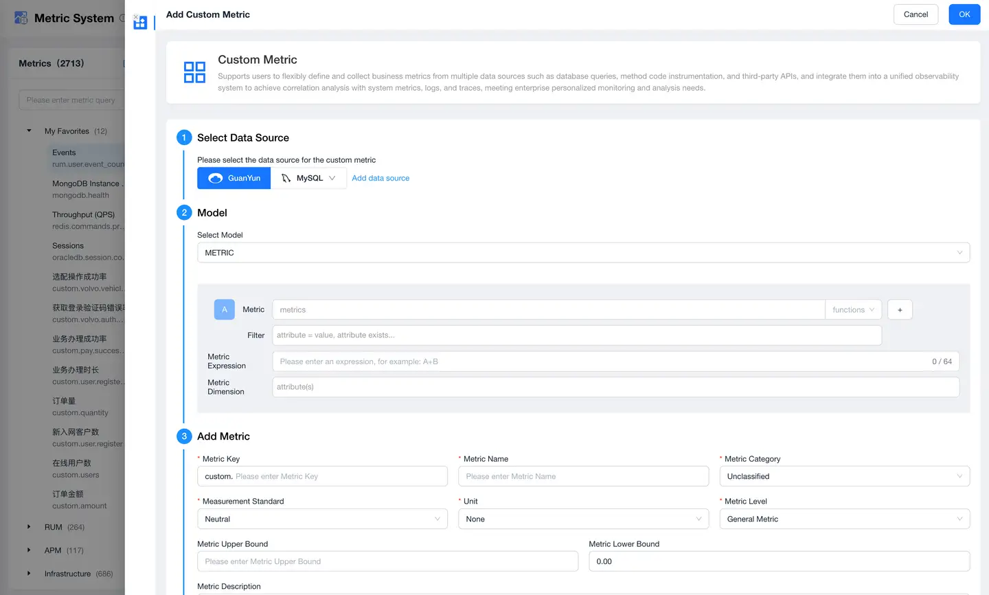 | 3 Add Metric | Metric Key | Unique identifier of the metric, usually named in English |