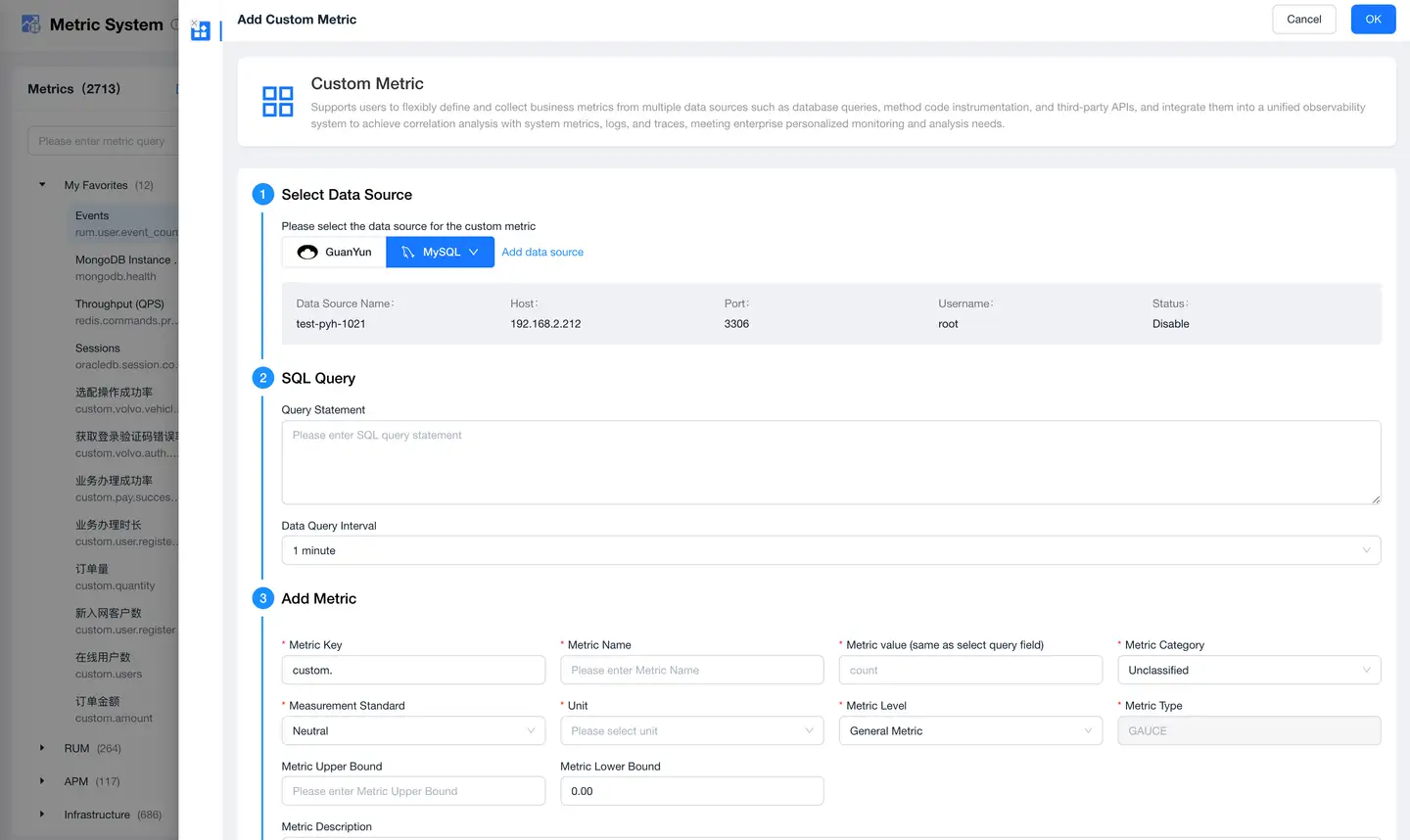 - Select the metric data source: Guanyun or MySQL.